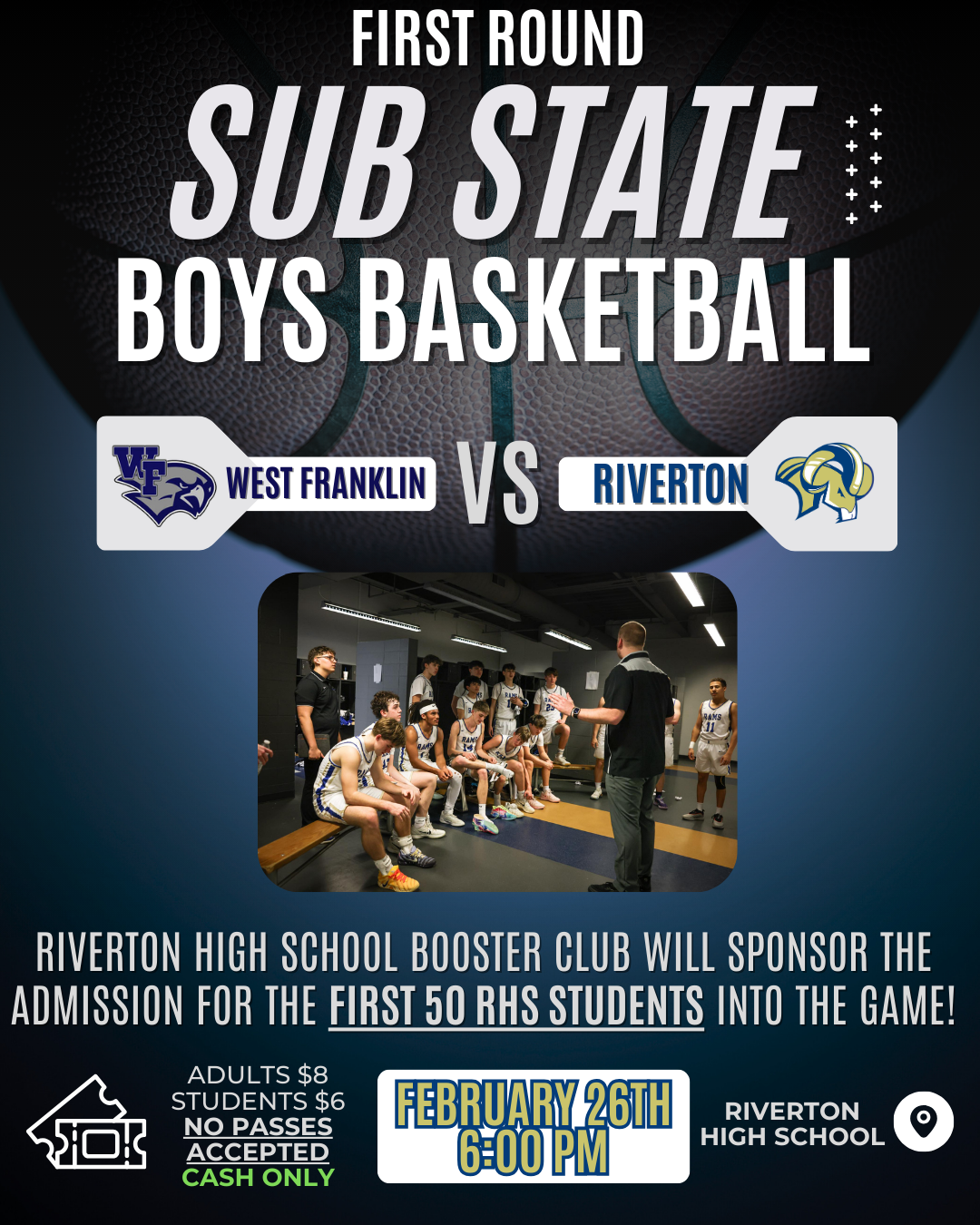 HS Boys Basketball @ HOME vs. Pomona-West Franklin🗓️Thursday, February 26, 2026📍Riverton High School📹https://fan.hudl.com/.../org.../6328/riverton-high-school...📸5 Star Media🎫RHS BOOSTER CLUB WILL ...