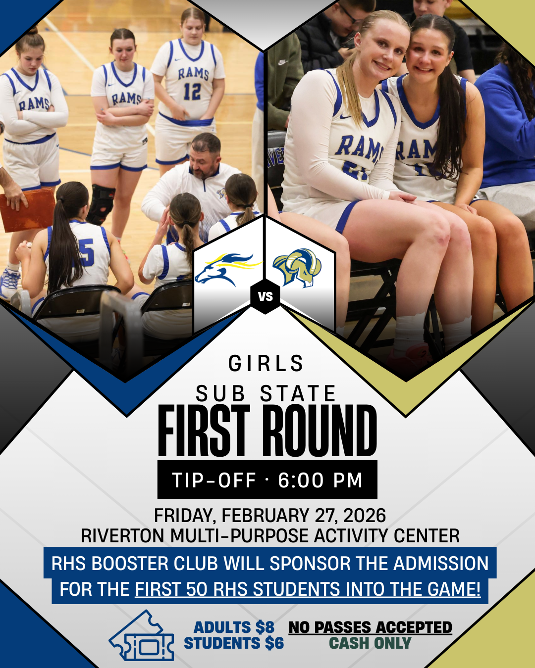 Girls Sub-State QuarterfinalHS Girls Basketball @ HOME vs. Iola🗓️Friday, February 27, 2026📍Riverton High School📹https://fan.hudl.com/.../org.../6328/riverton-high-school...📸5 Star Media🎫RHS BOOSTER...