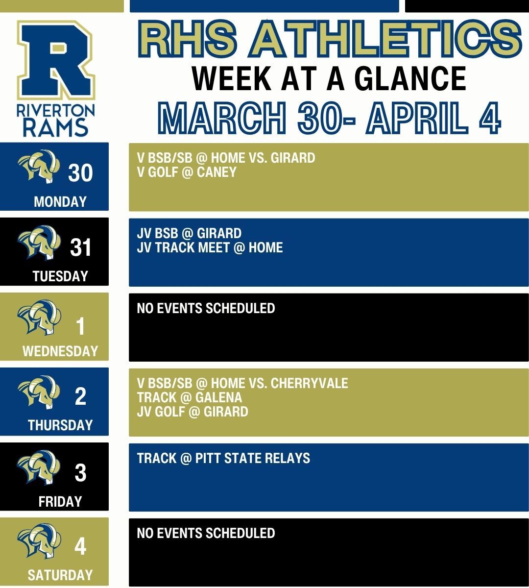 Upcoming RHS Senior Dates 2026:April 11th- Prom April 14th- Senior Scholarship InterviewsApril 29th-Senior Awards Assembly 6:00pm in the AuditoriumApril 30-May 2nd-Sr Trip: No Seniors will be requi...